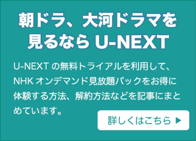 朝ドラ・最新回と過去回の見逃しは、お得な U-NEXT 無料トライアル利用がオススメ。U-NEXTのトライアル申し込み特典(=1000円分のポイント)を投入すれば、NHKオンデマンド・見放題コース(月額990円)を最大一ヶ月間お試しで楽しめます。